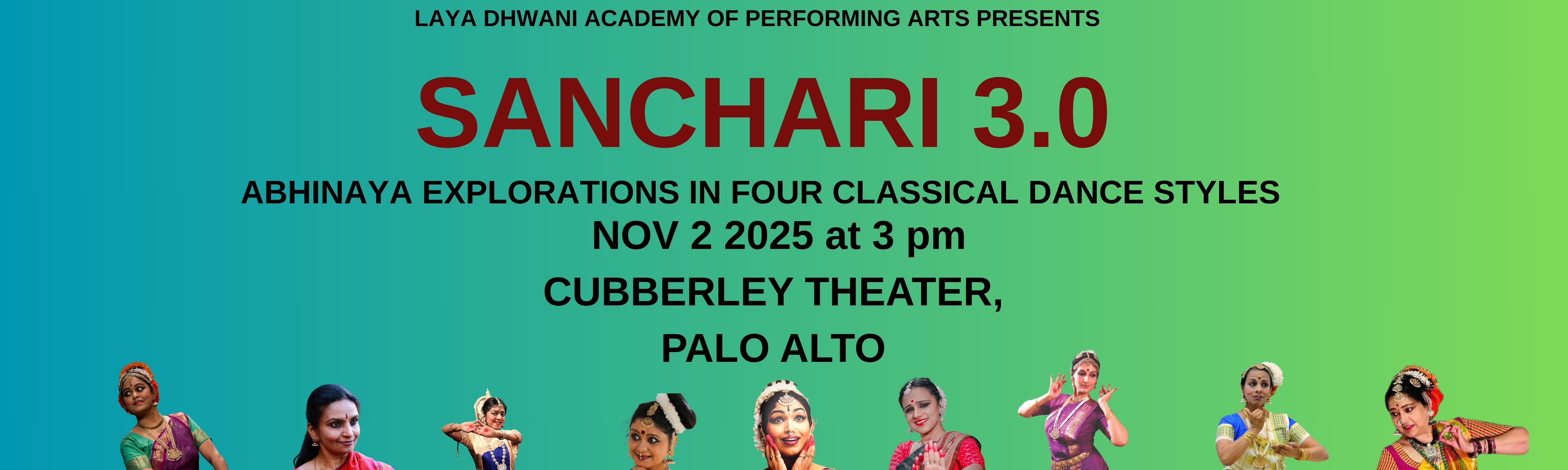Laya Dhwani Academy of Performing Arts proudly presents Sanchari 3.0 - a special curation of rare abhinaya gems in four Indian Classical dance styles - Bharatanatyam Kuchipudi Mohiniattam and Odissi. This special edition features senior established gurus of the Bay Area - Smt. Bindu Pratap, Smt. Gayatri Joshi, Smt. Indumathy Ganesh, Smt. Madhuri Kishore, Smt. Niharika Mohanty, Smt. Nirupama Vaidyanathan, Smt. Samidha Satyam, Smt. Shobha Subramanian and Smt. Sunita Pendekanti.